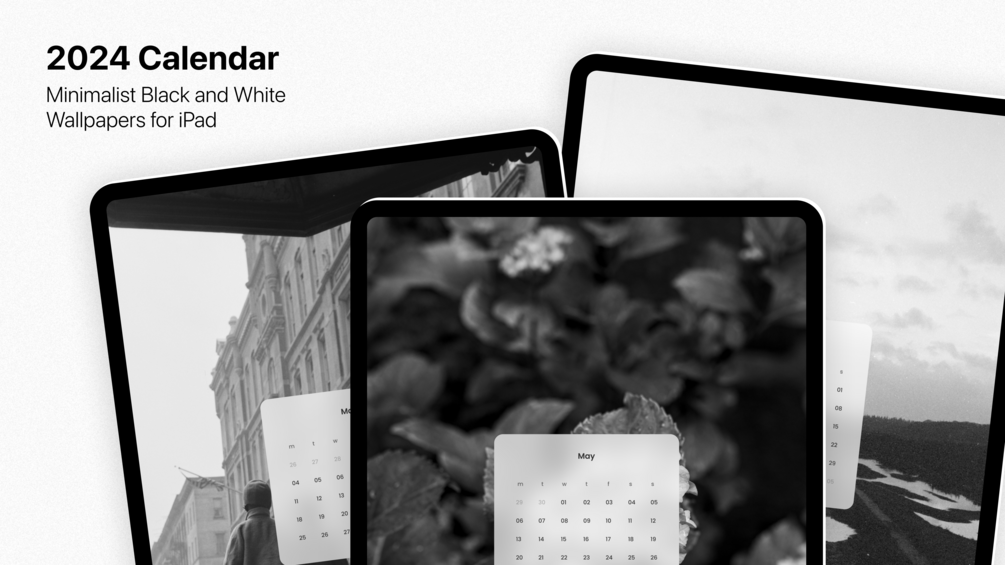 Introducing our minimalist black and white wallpaper collection featuring 12-month calendars for the year 2024, optimized for iPad.